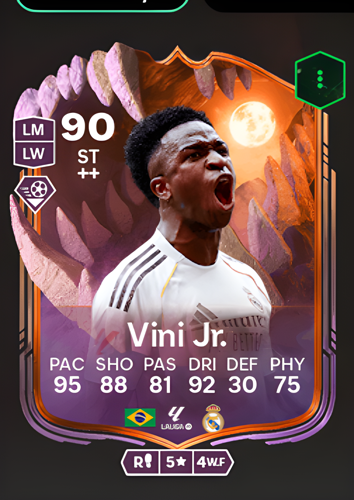 Vinícius José de Oliveira Júnior's Ultimate Scream card stands out as a formidable Striker, boasting an impressive overall rating of 90. With a blistering pace of 95, exceptional dribbling at 92, and a sharp shooting rating of 88, this card captures the essence of a lethal forward capable of unsettling any defense. Complemented by a solid passing rating of 81 and reliable physicality at 75, Vinícius Júnior's Ultimate Scream card is tailor-made for players seeking a dynamic attacker. As a striker, his explosive speed and technical prowess enable him to break through defensive lines with ease, creating and converting goal-scoring opportunities that can decisively turn the tide of any match.