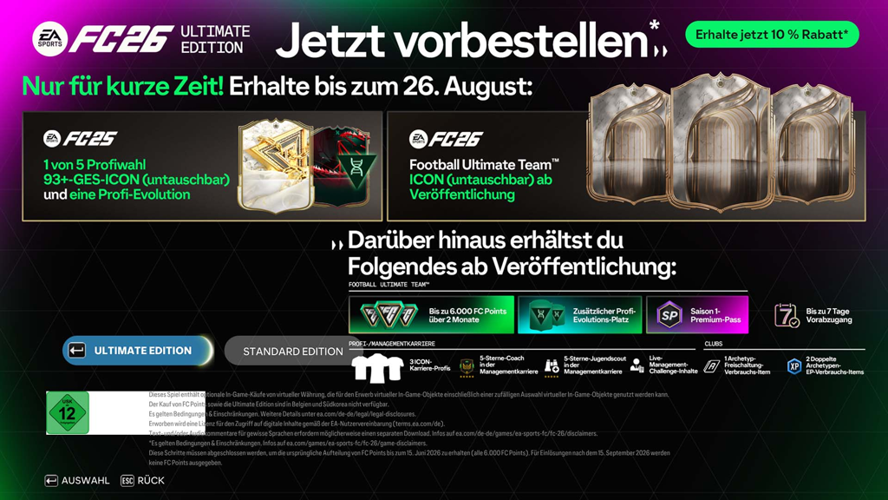 Bei beiden Editionen sind besondere Belohnungen enthalten, doch die Ultimate Version bietet zusätzliche FC Points sowie einen früheren Zugang zum Spiel, was vor allem für Vollblut-Fans interessant ist. Für Besitzer der Vorversion FC 25 gibt es zudem einen Rabatt von 10 %. Wichtig zu wissen: Alle Vorbesteller-Boni sind nicht übertragbar oder handelbar.